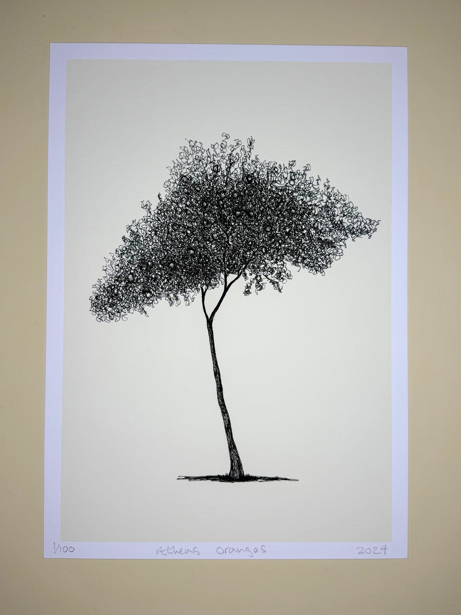 Athens Orange Tree is a limited edition A4 giclée print based on an original drawing made on location in Athens, Greece. This compact citrus tree stood confidently near the port, surrounded by concrete, scooters, and soft heat. A quiet observer of chaos, captured with slow lines and a soft gaze.