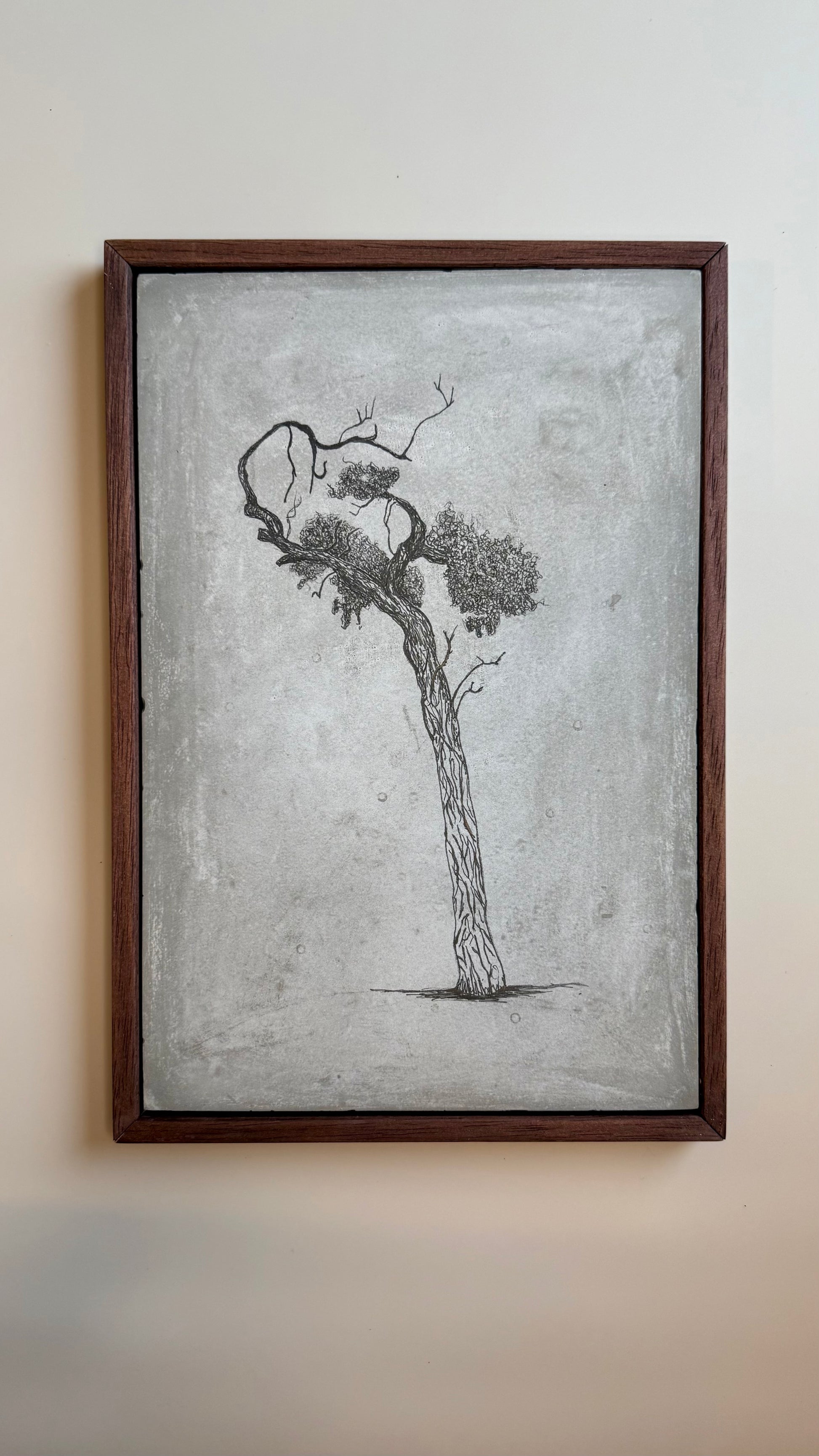The tile is presented in a simple wooden frame, giving the piece weight and presence while keeping the focus on the drawing itself. The contrast between the delicacy of the line and the solidity of the cement reflects the tension between fragility and endurance that runs through much of my work.