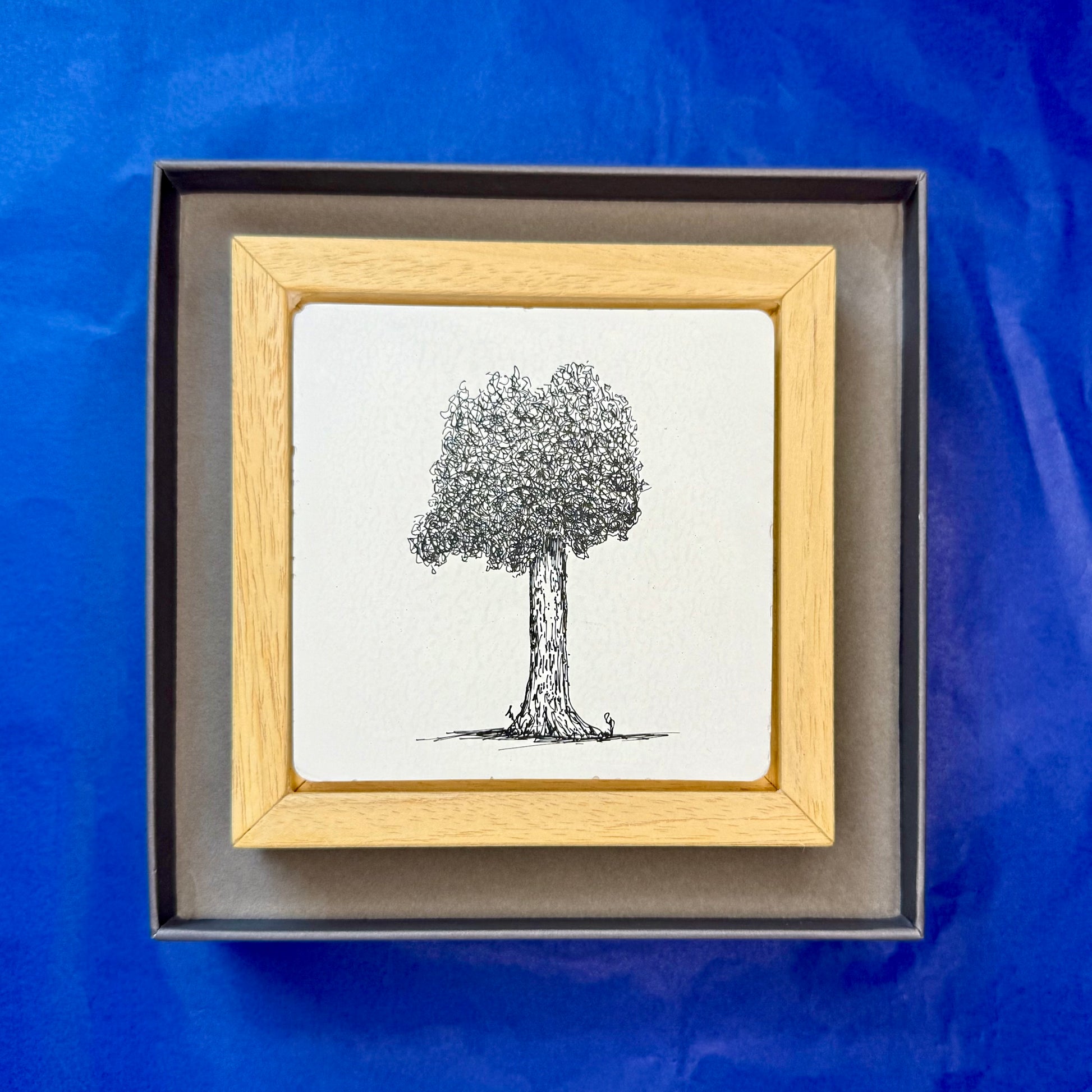 A quietly upright tree, drawn in fine-line ink on a cement tile. This piece has a sense of steadiness to it, like it’s standing calmly in its own space. The rounded crown and narrow trunk give it a tidy, self-contained energy — one of those trees that doesn’t need to shout to make an impression.