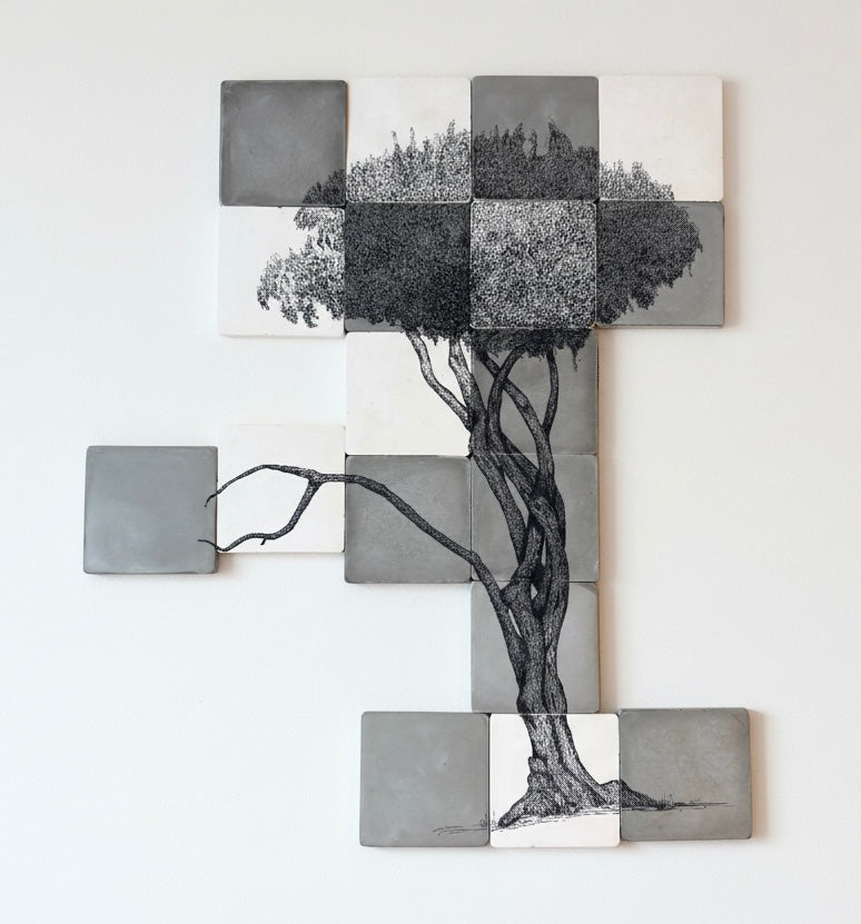 The image has been hand-drawn in black ink directly onto individual cement tiles, which are then arranged to form the complete composition. The natural variation in tone, texture, and surface marks across the tiles is part of the work, giving the piece a subtle sense of age and material presence that contrasts with the delicacy of the drawing.