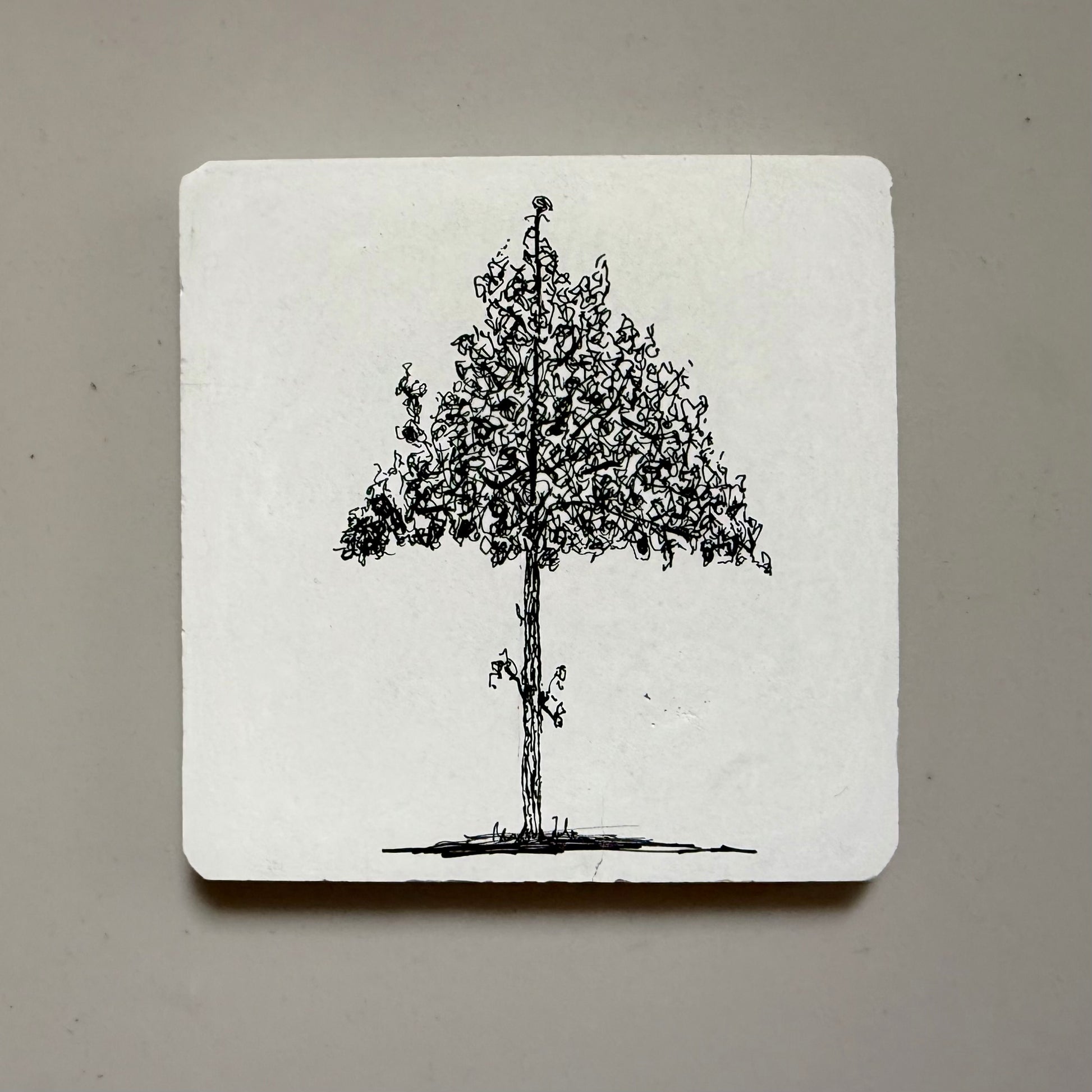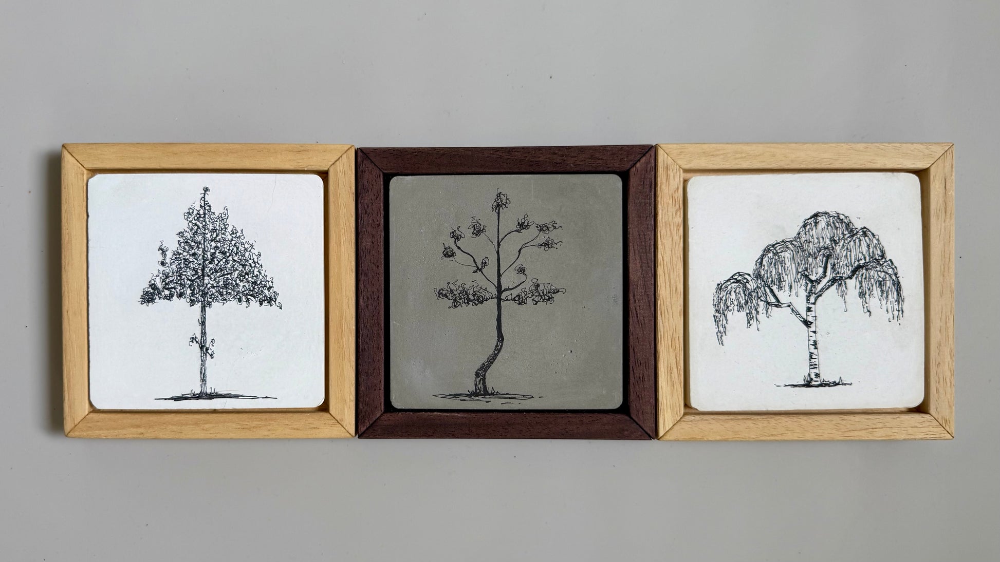 A hand-cast cement tile featuring one of my original tree drawings, framed in natural wood and presented in a gift box. Each piece is individually made in my studio, combining texture and line with quiet precision. The drawing is printed directly onto the cement surface, revealing subtle imperfections that make every tile unique.